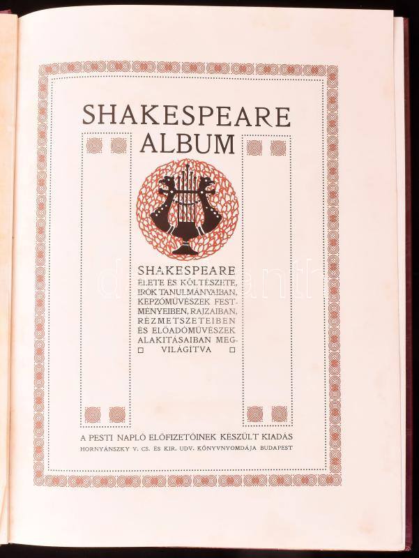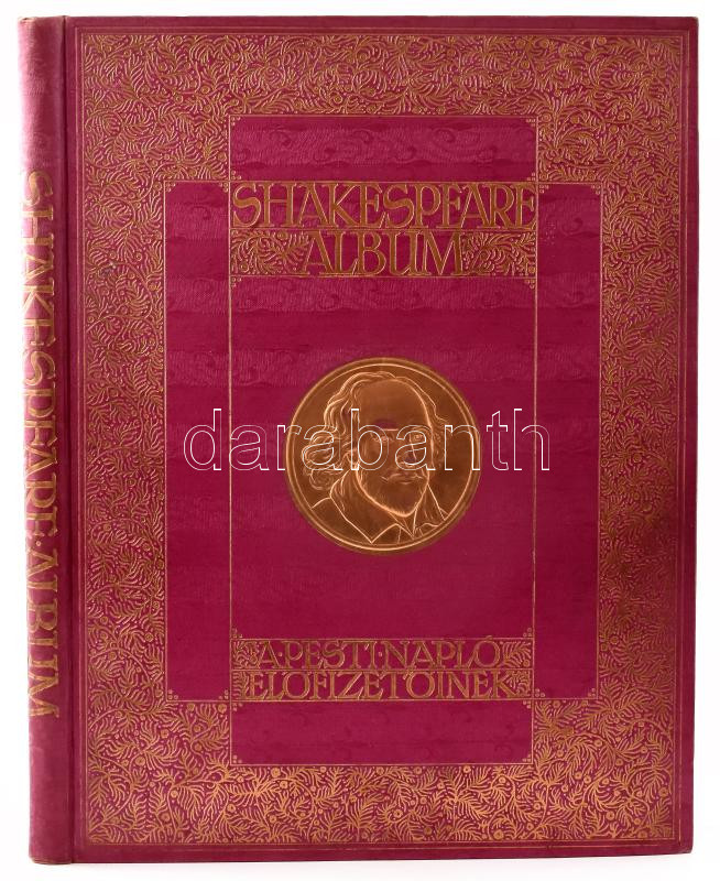 Shakespeare album. Shakespeare élete és költészete, írók tanulmányaiban, képzőművészek festményeiben, rajzaiban, rézmetszeteiben és előadóművészek alakításaiban megvilágítva. A Pesti Napló előfizetőinek készült kiadás. (Bp., 1910), Hornyánszky-ny., 1 (címkép) t.+ 132 p.+ 12 (színes, feliratozott hártyapapírral) t. Kiadói aranyozott, dombornyomott Shakespeare-portréval díszített egészvászon-kötés, a borítón némi kopással, összességében jó állapotban.