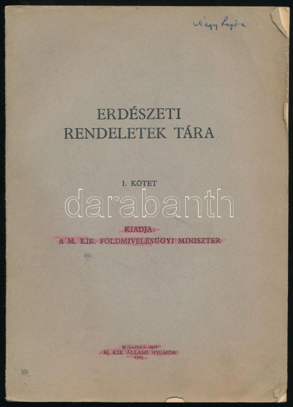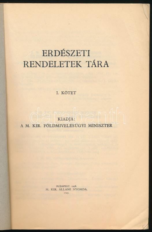 Erdészeti rendeletek tára. I. köt. Kiadja: A M. Kir. Földmivelésügyi Miniszter. Bp., 1938, M. Kir. Állami Nyomda, 291 p. Kiadói papírkötés, kissé sérült borítóval.