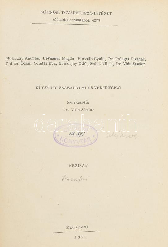 Külföldi szabadalmi és védjegyjog. Szerk.: Dr. Vida Sándor. Kézirat. Mérnöki Továbbképző Intézet előadássorozatából 4277. Bp., 1964, Felsőoktatási Jegyzetellátó Vállalat, 489 p. Félvászon-kötésben, intézményi bélyegzőkkel. Megjelent 458 példányban. A címlapon az egyik szerző, Somfai Éva (1930- ) vegyészmérnök, szabadalmi ügyvivő autográf aláírásával.