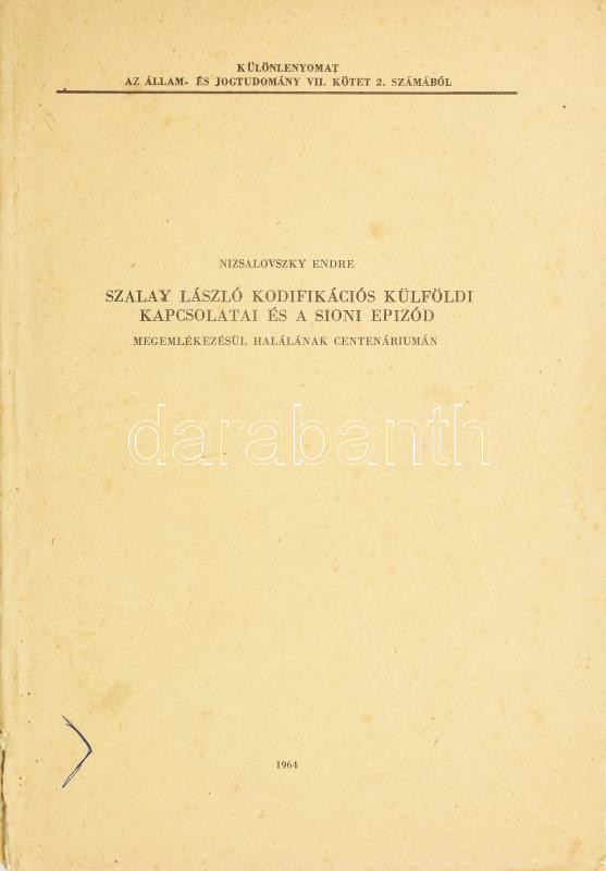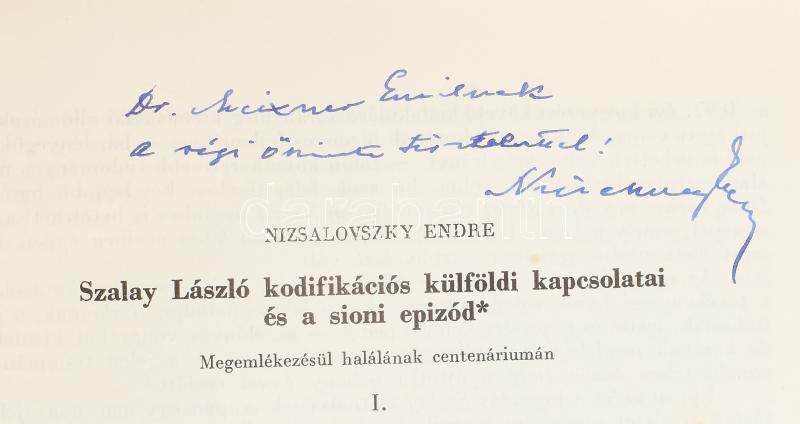 Nizsalovszky Endre: Szalay László kodifikációs külföldi kapcsolatai és a sioni epizód. (DEDIKÁLT). Különlenyomat az Állam- és Jogtudomány VII. kötet 2. számából. (Bp., 1964, Akadémiai Ny.), 1 t.+ 175-206 p. Kiadói tűzött papírkötés, a borítón sérüléssel. A szerző, Nizsalovszky Endre (1894-1976) nemzetközi hírű jogtudós és kodifikátor, az MTA tagja által Meixner Emil (1892-1976) földbirtokos, gazdálkodó, országgyűlési képviselő részére DEDIKÁLT példány.