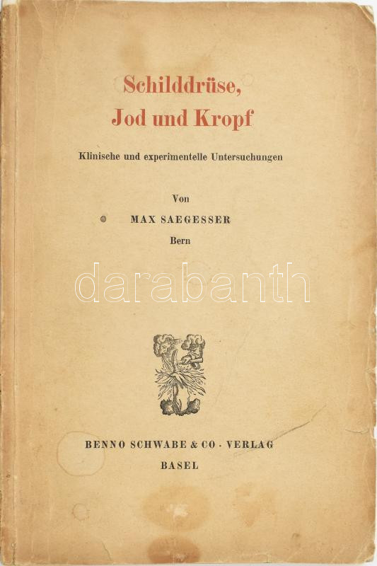 Max Saegesser: Schilddrüase, Jod und Krop. Klinische und experimentelle Untersuchungen. Basel, 1939, Benno Schwabe & Co. Német nyelven. Kiadói papírkötés, kissé sérült gerinccel, foltos borítóval.