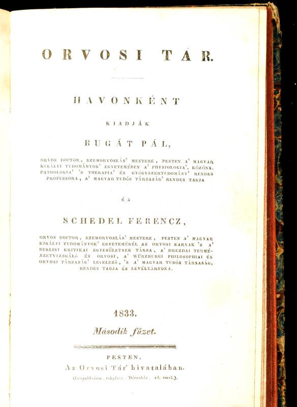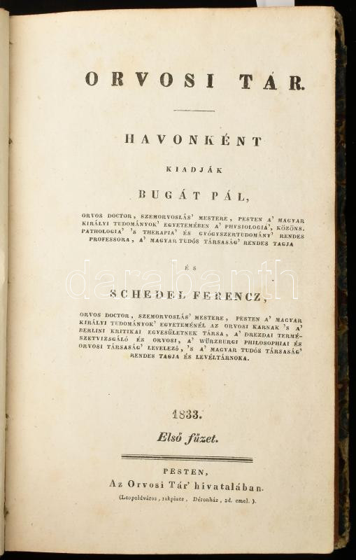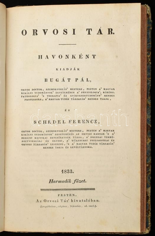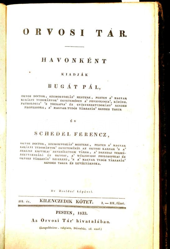 Orvosi tár. Havonként kiadják Bugát Pál és Schedel Ferenc. IX. kötet. III. év. I-III. füzet. Pesten, 1833, Orvosi Tár', 248+2 p. Korabeli kartonált papírkötés, kopott borítóval, volt könyvtári példány, bélyegzésekkel.