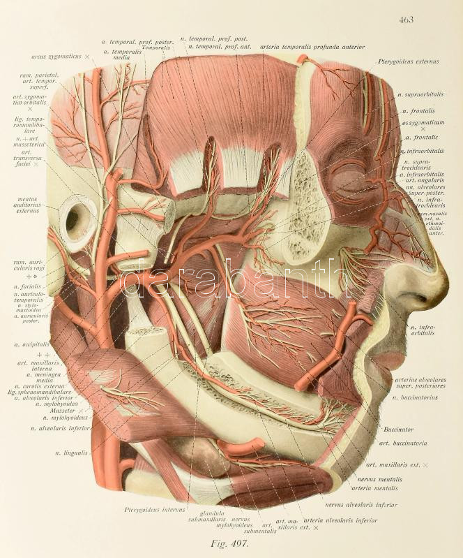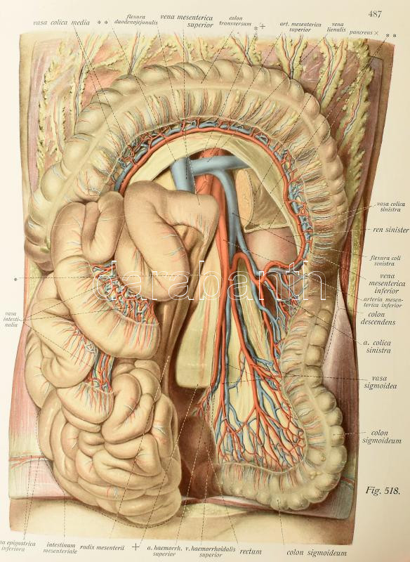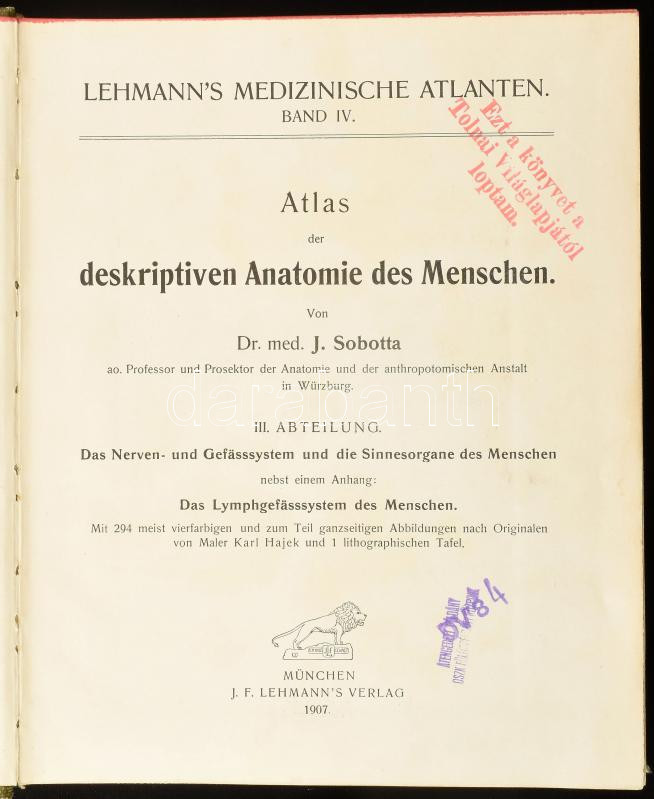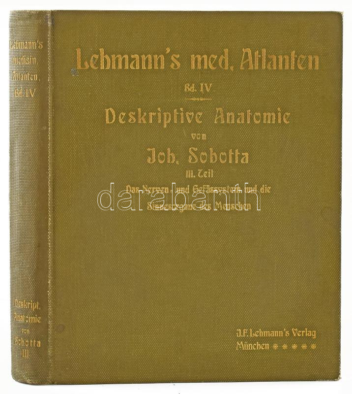 Sobotta, Johannes: Atlas der deskriptiven Anatomie des Menschen. III. Abteilung. Das Nerven- und Gefässsystem und die Sinnesorgane des Menschen, nebst einem Anhang: Das Lymphgefässsystem des Menschen. Lehmann's medizinische Atlanten Band IV. München, 1907, J. F. Lehmann's Verlag. Gazdag fekete-fehér és színes képanyaggal illusztrálva. Német nyelven. Kiadói aranyozott egészvászon-kötés, kissé foltos, kopottas borítóval, bélyegzésekkel, volt könyvtári példány.