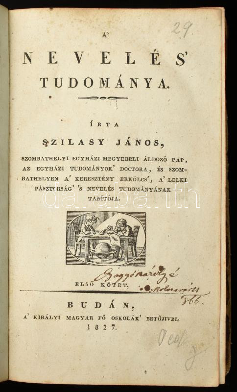 Szilasy János: A nevelés' tudománya I. köt. Buda, 1827, A' Királyi Magyar Fő Oskolák betűjivel, XXVI+366 p. Első kiadás. Korabeli aranyozott gerincű félbőr-kötés, sérült gerinccel, kopott borítóval, a címlapon possessori névbejegyzéssel (Gyogyó Károlyé Kolozsvártt '866), intézményi bélyegzéssel.