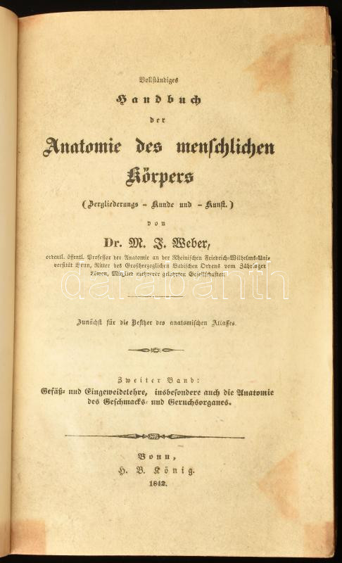 Weber, M[oritz] I[gnaz]: Vollständiges Handbuch der Anatomie des menschlichen Körpers. Zweiter Band. Bonn, 1842, H. B. König,2+622 p. Német nyelven. Aranyozott félbőr-kötésben, mintás lapélekkel, kopott borítóval, egy-két foltos lappal.