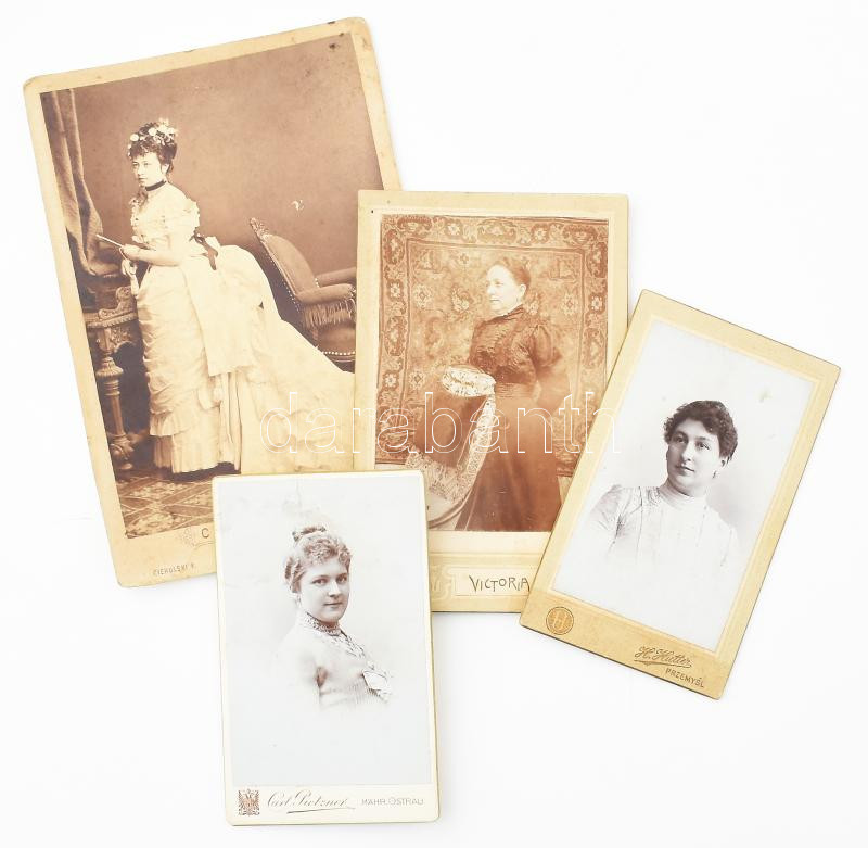 Beschreibung: Hölgyek, divat 4 db keményhátó fotó vizitkártya és kabinetfotó