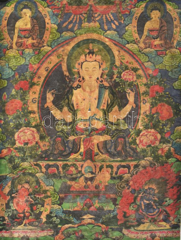Thangka, Avalókitésvara ábrázolással. Tibet vagy Kína, XX. sz. első fele, nyomat, vászon. 89x67 cm, korának megfelelő állapotban, hátulján kopott, foltos, feltekerve.