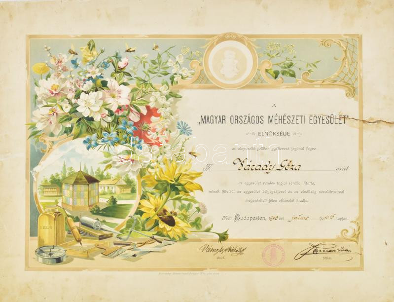 1903 Magyar Országos Méhészeti Egyesület nagy méretű litografált tagsá... https://www.darabanth.com/de/459-Fernauktion/459.0/Kunst-Dokumente-andere-Sammelgebiete/Dokument~1000020/1903-Magyar-Orszagos-Meheszeti-Egyesulet-nagy-meretu-litografalt-tagsagi-oklevel-kartonon-egy~II3077411