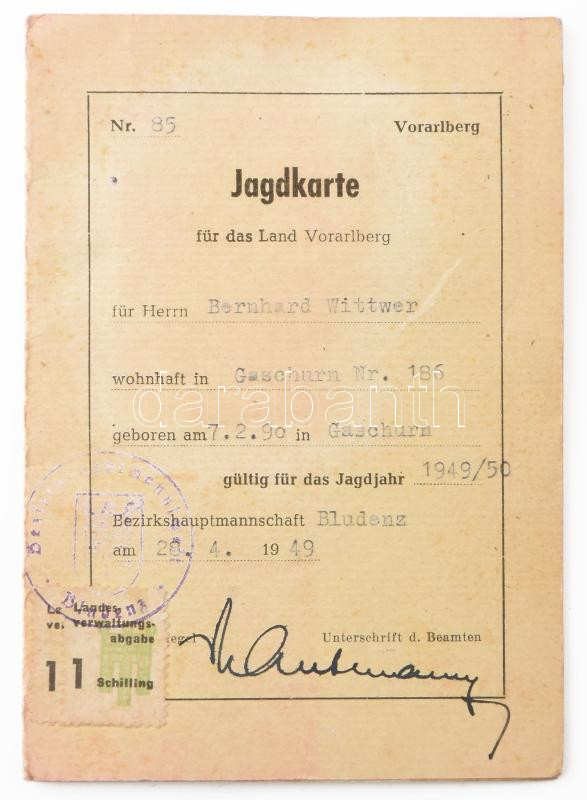 1949 Osztrák vadászkönyv, kitöltve https://www.darabanth.com/de/459-Fernauktion/459.0/Kunst-Dokumente-andere-Sammelgebiete/Dokument~1000020/1949-Osztrak-vadaszkonyv-kitoltve~II3075188