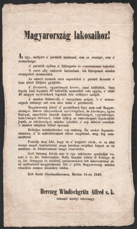Beschreibung: 1849. március 11. Buda, Windischgrätz herceg Magyarország lakosaihoz címzett kiáltványa