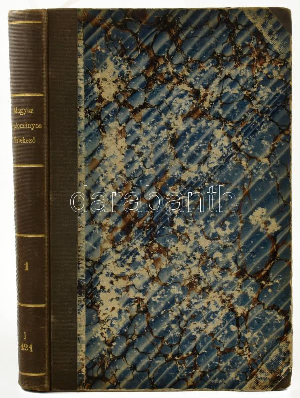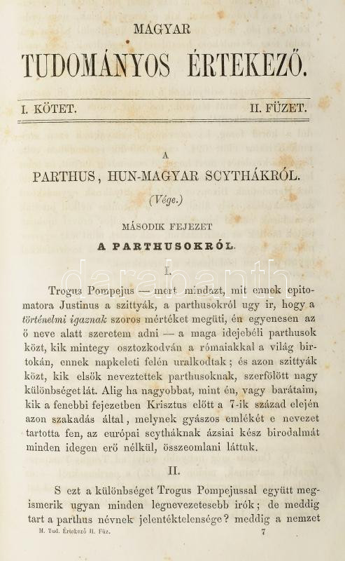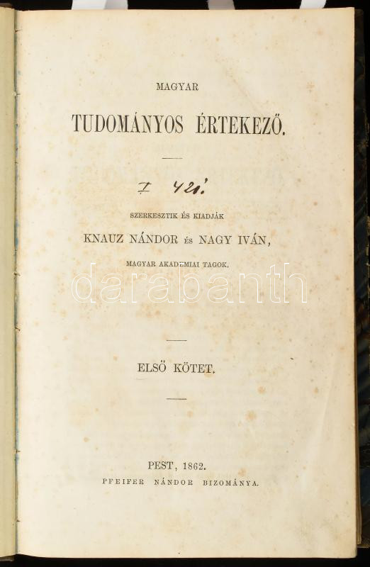 1862 Magyar Tudományos Értekező. Szerk. és kiadják Knauz Nándor és Nagy Iván, magyar akademiai tagok. I. köt. Pest, 1862, Pfeifer Nándor, (Esztergom,Horák Egyed-ny.), 480 p. Benne érdekes írásokkal, közte Bartal György: A parthus-hunmagyar-scythákról befejezéseül, Knauz Nándor: A budai királyi várpalota kápolnája, [Fraknói Vilmos] Frankl Vilmos: A magyar nemzet bevándorlásának története...stb. Átkötött félvászon-kötés, kopott borítóval, intézményi bélyegzéssel, kissé (foxing) foltos lapokkal. Magyar Tudományos Értekező c. tudományos, könyvészeti és kritikai folyóirat 1862-ben jelent meg. Összesen 11 számot, mintegy 2 kötetet ért meg, és az év végével megszűnt.