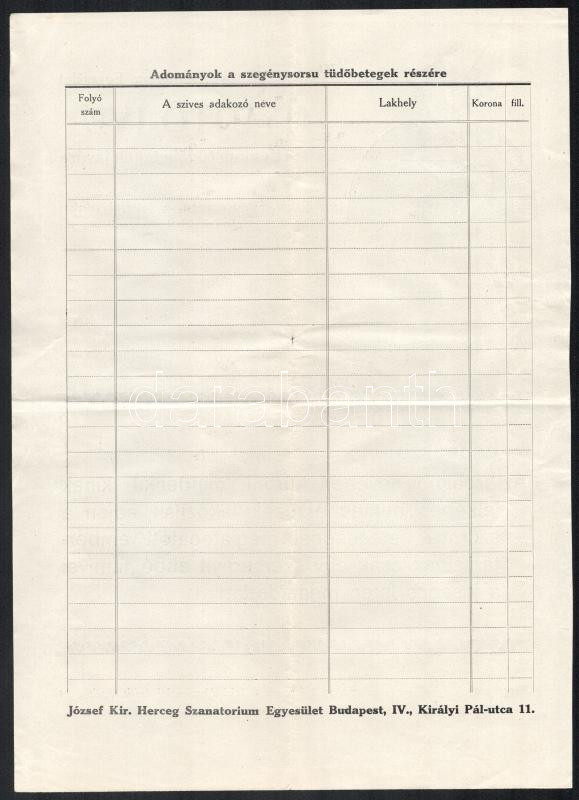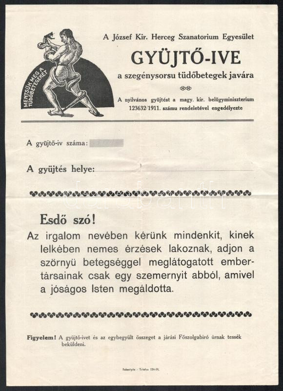 1911 A József. kir. herceg Szanatórium Egyesület gyűjtőíve tüdőbetegek... https://www.darabanth.com/de/459-Fernauktion/459.0/Kunst-Dokumente-andere-Sammelgebiete/Drucksachen~2000036/1911-A-Jozsef-kir-herceg-Szanatorium-Egyesulet-gyujtoive-tudobetegek-szamara~II3070051
