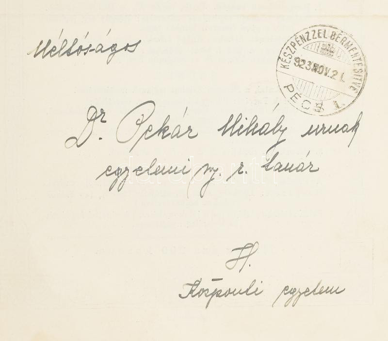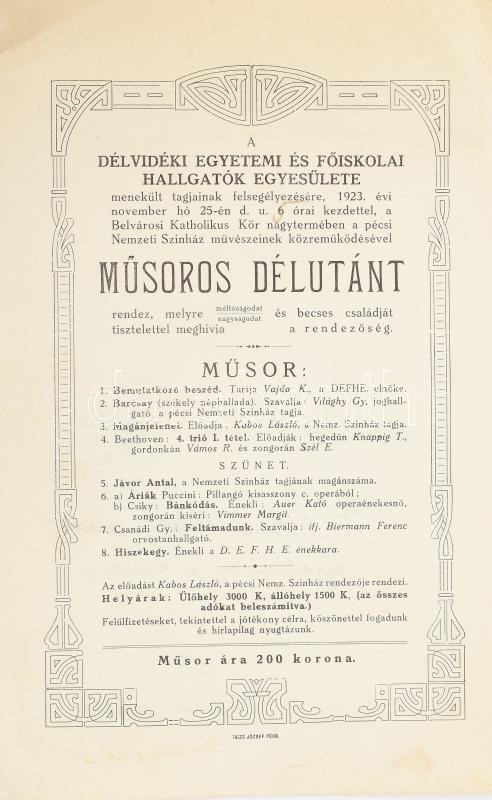 1923 Pécs, meghívó a Délvidéki Egyetemi és Főiskolai Hallgatók Egyesülete menekült tagjainak segélyezésére rendezett műsoros délutánra, Pekár Mihály (1871-1942) orvos, fiziológus, egyetemi tanár részére címezve, 23,5x15 cm