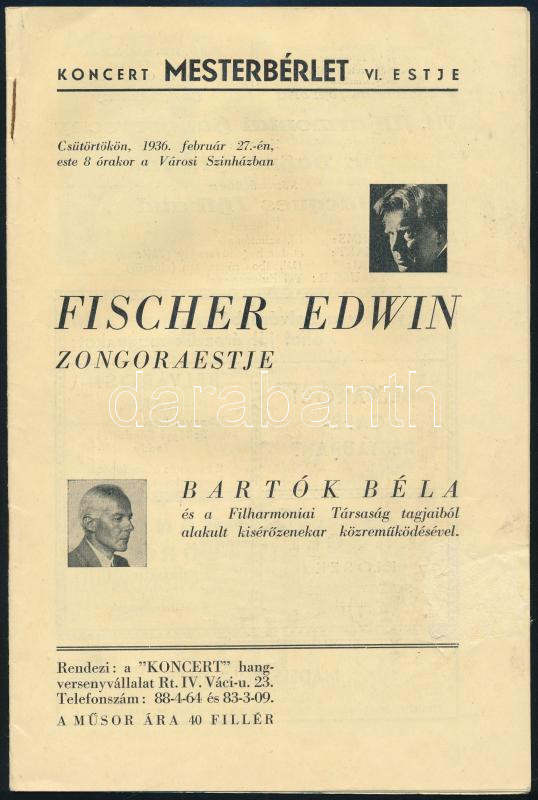 1936 A Mesterbérlet koncert VI. estje, többek között Bartók Béla, Fisc... https://www.darabanth.com/de/459-Fernauktion/459.0/Kunst-Dokumente-andere-Sammelgebiete/Drucksachen~2000036/1936-A-Mesterberlet-koncert-VI-estje-tobbek-kozott-Bartok-Bela-Fischer-Edvin-fellepesevel-~II3075694