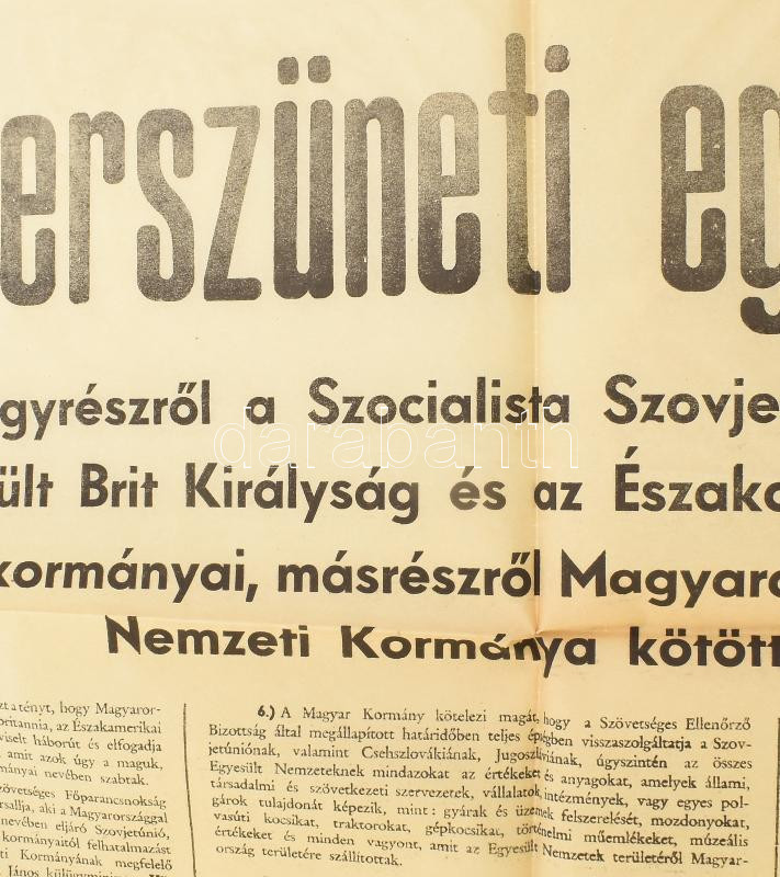 1945 Fegyverszüneti egyezmény, melyet egyrészről a Szocialista Szovjet Köztársaságok, az Egyesült Brit Királyság és az Északamerikai Egyesült Államok Kormányai, másrészről Magyarország Ideiglenes Nemzeti Kormánya kötöttek. Moszkva, 1945. január 20. Nagyméretű hirdetmény. Hajtva, jó állapotban, 73x65 cm