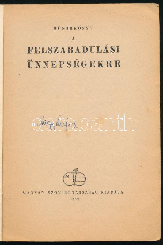 1950 Műsorkönyv a felszabadulási ünnepségekre. Magyar Szovjet Társaság... https://www.darabanth.com/de/459-Fernauktion/459.0/Kunst-Dokumente-andere-Sammelgebiete/Drucksachen~2000036/1950-Musorkonyv-a-felszabadulasi-unnepsegekre-Magyar-Szovjet-Tarsasag-kiadasa-Kiadoi-papirkotes-~II3072550