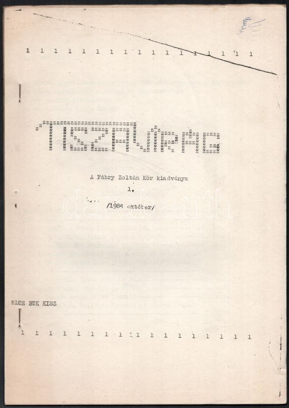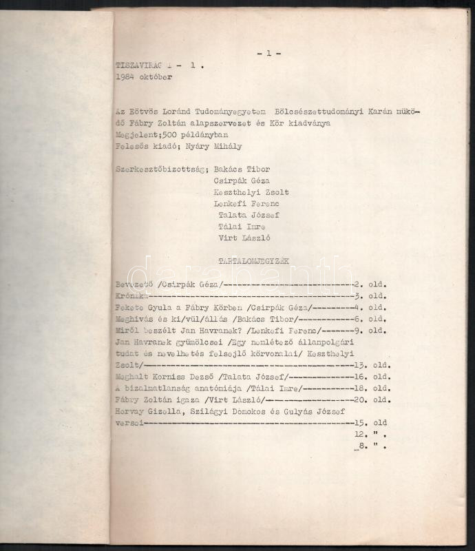 1984 Tiszavirág. 1. évf. 1. szám. 1984. október. Szerkesztőbizottság: Bakács Tibor, Csirpák Géza, Keszthelyi Zsolt, Lenkefi Ferenc, Talata József, Tálai Imre, Virt László. Felelős kiadó: Nyáry Mihály. Az ELTE BTK Fábry Zoltán alapszervezet és a Kör kiadványa. Bp., 1984, Fábry Zoltán Kör, 29 p. Szamizdat folyóirat. Megjelent 500 példányban.