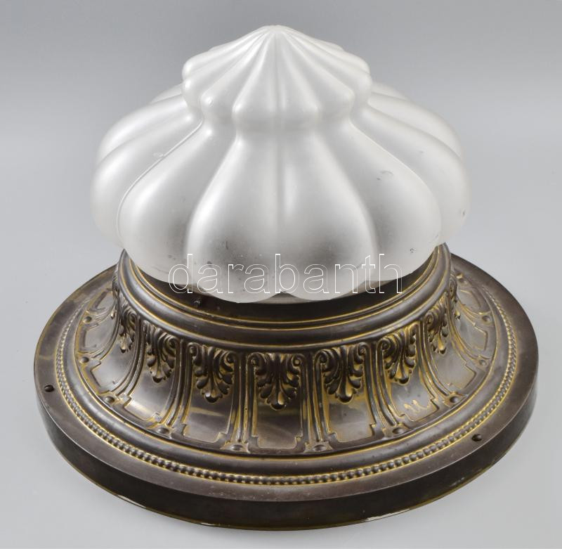 Beschreibung: Réz mennyezeti lámpa üveg búrával, porcelán foglalattal. (bura szélén felszereléskor nem látható lepattanásokkal) d: 40 cm