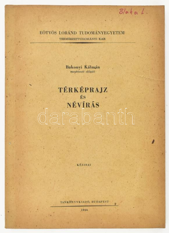 Bakonyi Kálmán: Térképrajz és névírás. ELTE Természettudományi Kar. Bp... https://www.darabanth.com/de/459-Fernauktion/459.0/Kunst-Dokumente-andere-Sammelgebiete/Landkarten~2000010/Bakonyi-Kalman-Terkeprajz-es-neviras-ELTE-Termeszettudomanyi-Kar-Bp-1966-Tankonyvkiado~II3077113