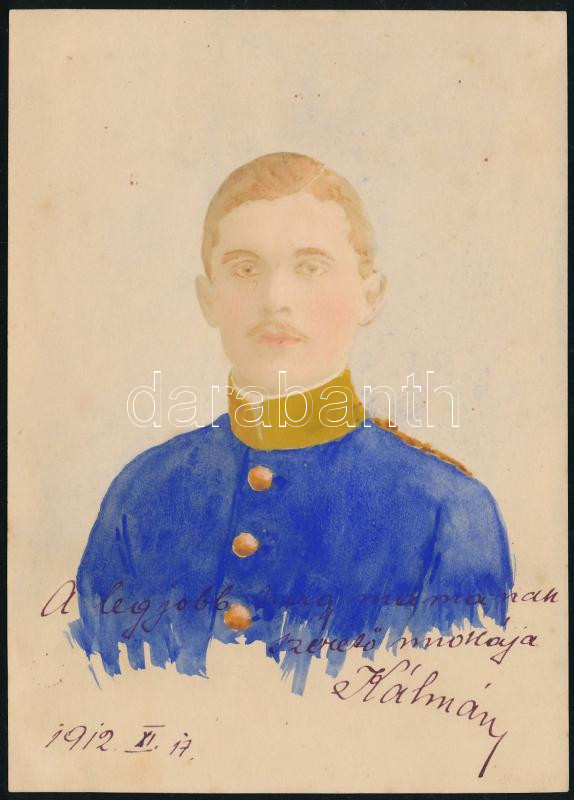 1912 "A legjobb nagymamának szerető unokája Kálmán", magyar katona por... https://www.darabanth.com/de/459-Fernauktion/459.0/Kunst-Dokumente-andere-Sammelgebiete/Militaria~2000009/1912-A-legjobb-nagymamanak-szereto-unokaja-Kalman-magyar-katona-portreja-akvarellel-szinezett~II3047596