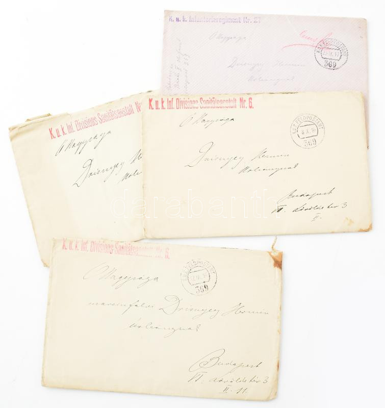 1916-1917 Dr. Petróczy Miklós (1892-1953), az első magyarországi véradás megszervezőjének I. világháborús tábori posta levelezése, 4 db levél borítékkal, "K. u. k. Inf. Divisions-Sanitätsanstalt Nr. 6." ill. "K. u. k. Infanterieregiment Nr. 27." bélyegzésekkel