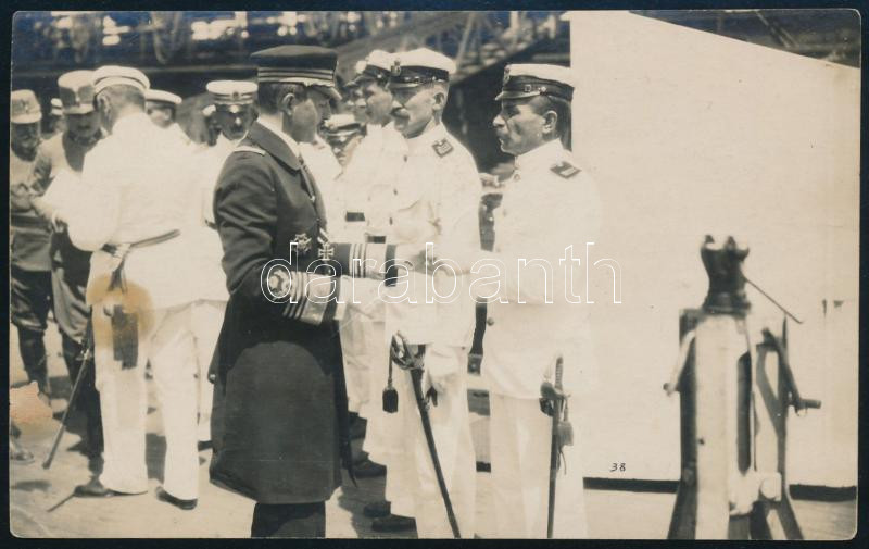 1917 Az S.M.S. Novaral Spaun osztrák-magyar hadihajó fedélzetén IV. Károly császár és király látogatása alkalmával matrózokkal beszél. Eredeti pecséttel jelzett fotó 14x9 cm / Kaiser Karl I speaks to officers on board S.M.S. Novara on June 3, 1917. Black-and-white original photograph by Brüder Schuhman of Vienna.14x9 cm