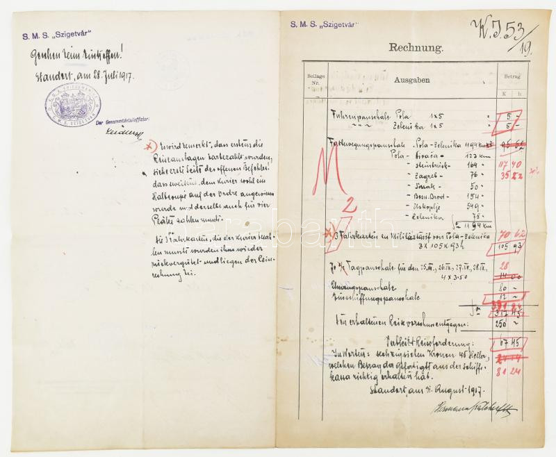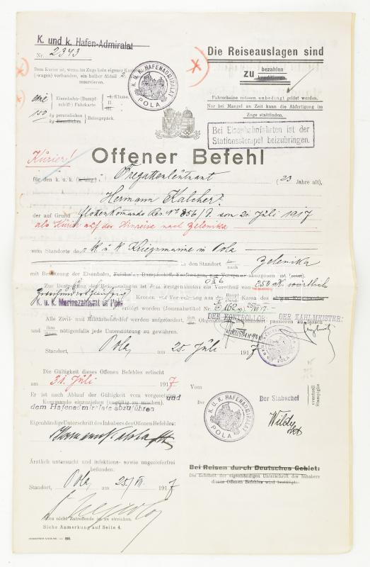 1917 Nyílt parancs Fregattenleutnant Herman Kalch részére Polából Zelenikába számos hajóbélyegzővel, közöttük az S.M.S. Szigetvár osztrák-magyar Zenta osztályú cirkáló ritka, címeres bélyegzőjével. Valaki felülbírálta a kiszabott költségeket és elszámolható kilométereket. / Open Order for Fregattenleutnant Herman Kalcher (born in 1894, gazetted Fregattenleutenant on May 1, 1916) to travel from Pola to Zelenika, in the Bocche di Cattaro. The document, containing more than a dozen separate rubberstamps and seals, is a testament to the k.u.k. Kriegsmarine's devotion to bureaucratic detail. Someone went over Fregattenleutnant Kalcher's expenses with a red pencil and corrected the amounts, including allowable mileage for his train voyage.
