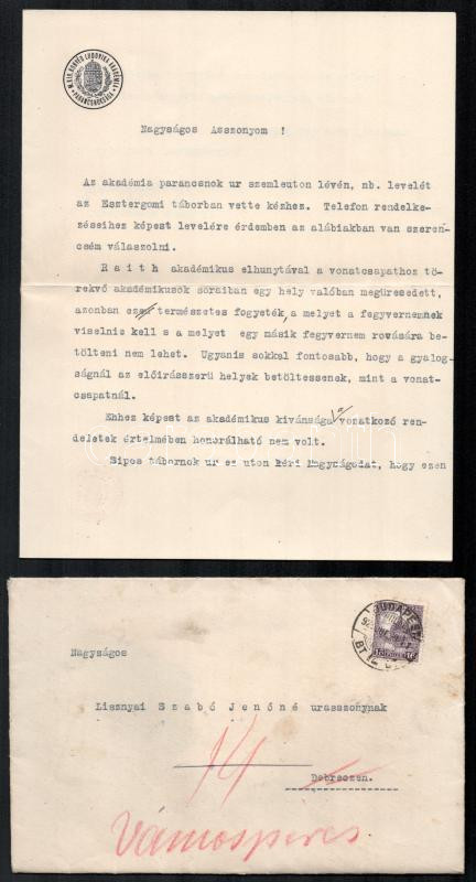 Beschreibung: 1928 Bp., a M. Kir. Honvéd Ludovika Akadémia levele Lisznyai Szabó Jenőné részére, segédtiszti aláírással, fejléces levélpapíron, borítékkal