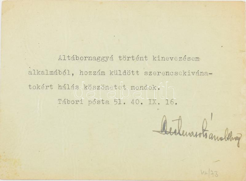 1940 Vitéz Decleva Zoltán (1887-1950) altábornagy, a 3. magyar hadsereg parancsnoka (1942-től vezérezredes, ill. magyar királyi titkos tanácsos) autográf aláírással ellátott, gépelt köszönő levele (altábornagyi kinevezése alkalmából), tábori posta levelezőlapon