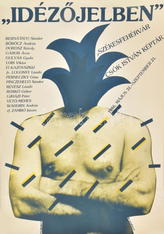 "Idézőjelben", El Kazovszkij, fe. Lugossy László, Pinczehelyi Sándor, Wahorn András, ef. Zámbó Ostván stb.. Csók István Képtár, Székesfehérvár, 1986. Plakát. Tervezte: Pinczehelyi Sándor, jelzett a plakáton. Sérült. 84x58,5 cm.