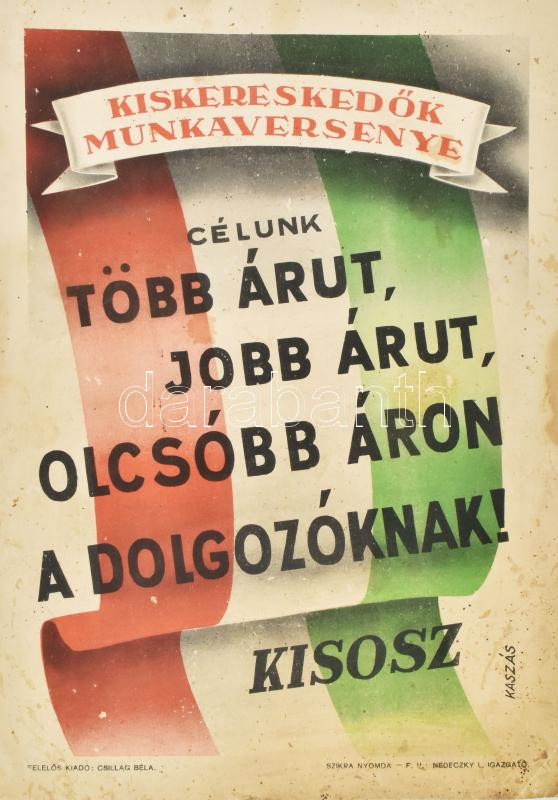 cca 1948 KISOSZ - Kiskereskedők Munkaversenye plakát, szign.: Kaszás, ... https://www.darabanth.com/de/459-Fernauktion/459.0/Kunst-Dokumente-andere-Sammelgebiete/Plakat~2000014/cca-1948-KISOSZ-Kiskereskedok-Munkaversenye-plakat-szign-Kaszas-Bp-Szikra-ny-foltos-~II3077238