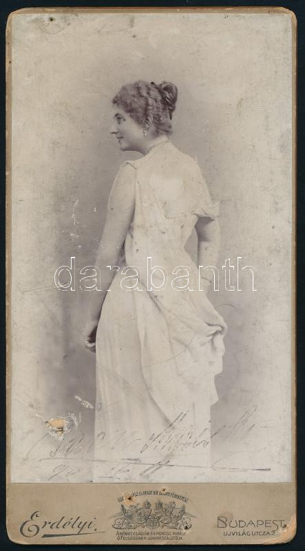 Beschreibung: 1901 Baán Mariska (1879-) színművész aláírt portréja, keményhátú fotó Erdélyi budapesti műterméből, rajzszög ütötte sérülésekkel, 20×11 cm