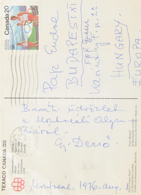 Beschreibung: Gyarmati Dezső olimpiai vízilabdázó és edző aláírása és sorai a Montreali olimpiáról hazaküldött képeslapon