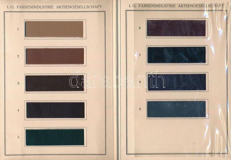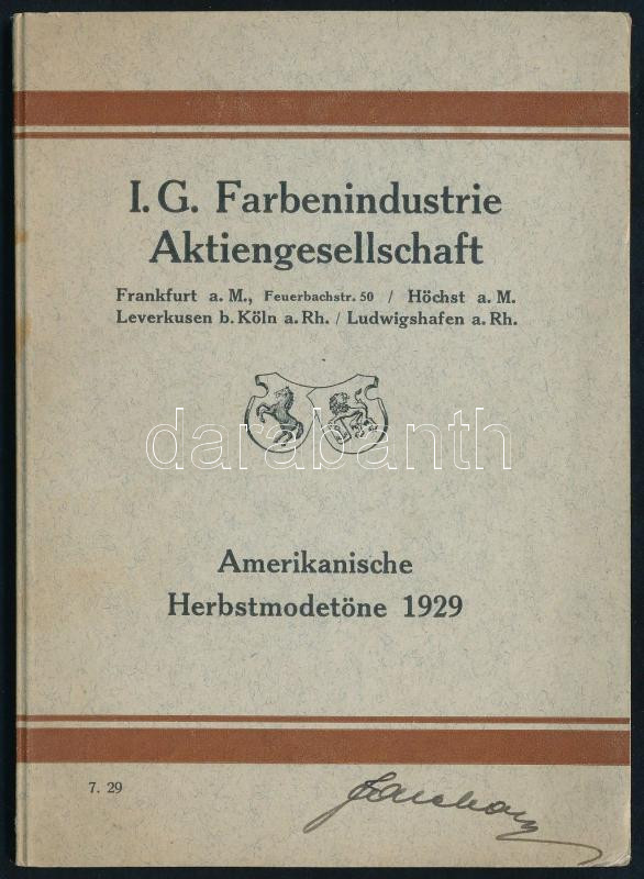 1929 I. G. Farbenindustrie Aktiengesellschaft - Amerikanische Herbstmodetöne 1929. Német nyelvű festékkatalógus, színmintákkal, 8 p.+2 t. Kartonált papírkötésben, jó állapotban. (Az Interessen-Gemeinschaft Farbenindustrie Aktiengesellschaft (röviden IG Farben) egy 1925-ben létrejött német vegyipari konszern volt. A náci párt hatalomra jutását követően fokozatosan átvette az irányítást a vállalat felett. 1940 és 1945 között a konszern nagy számban használt koncentrációs táborokban fogvatartott zsidókat rabszolgamunkásként. Emellett a cég egyik alvállalata gyártotta a Zyklon B gázt a II. világháború folyamán.)