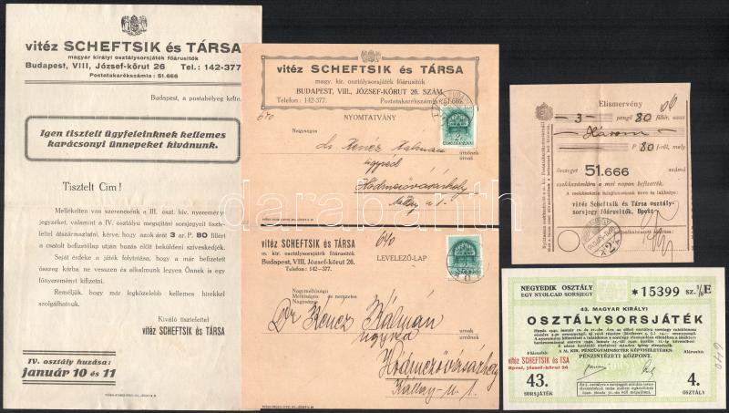 Beschreibung: 1939 vitéz Scheftsik és Társa osztálysorsjáték reklámanyag (hivatalos nyereményjegyzék, nyugta, sorsjegy, stb.), 6 db