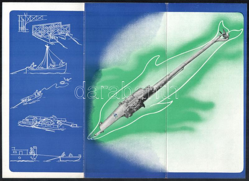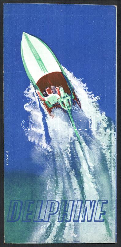 Sinkó Károly (1910-1967): "Delphine" motorcsónak (Csonka János Gépgyár) prospektus terv, XX. sz. közepe körül. Színes nyomat, papír, jelzett a nyomaton, kihajtva: 34x24,5 cm