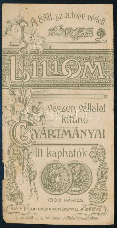 cca 1900 Liliom vászon vállalat szecessziós számolócédula https://www.darabanth.com/de/459-Fernauktion/459.0/Kunst-Dokumente-andere-Sammelgebiete/Werbungen~2000001/cca-1900-Liliom-vaszon-vallalat-szecesszios-szamolocedula~II3071264