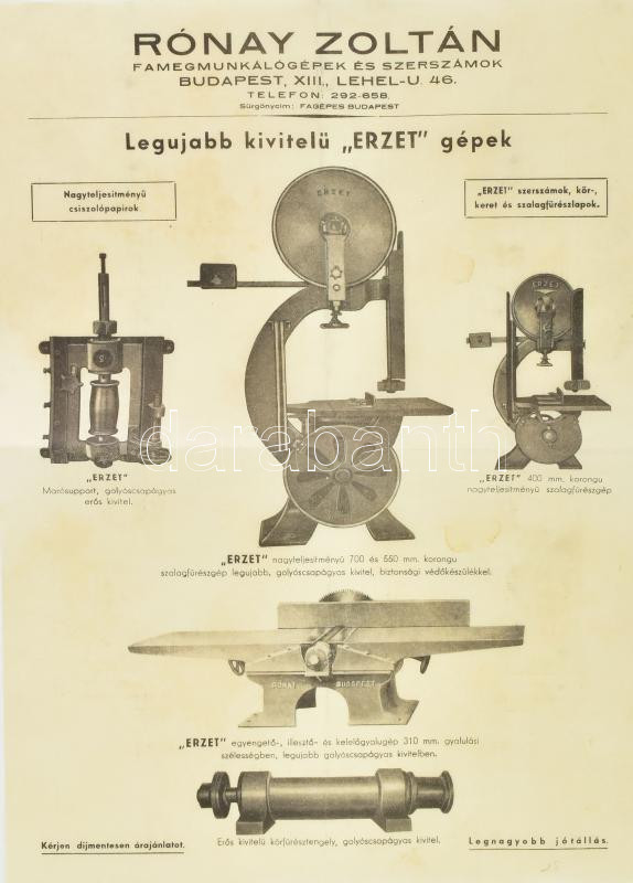 cca 1935 Rónay Zoltán famegmunkálógépek és szerszámok (Bp. XIII., Lehe... https://www.darabanth.com/de/459-Fernauktion/459.0/Kunst-Dokumente-andere-Sammelgebiete/Werbungen~2000001/cca-1935-Ronay-Zoltan-famegmunkalogepek-es-szerszamok-Bp-XIII-Lehel-u-46-Legujabb-kivitelu~II3074992