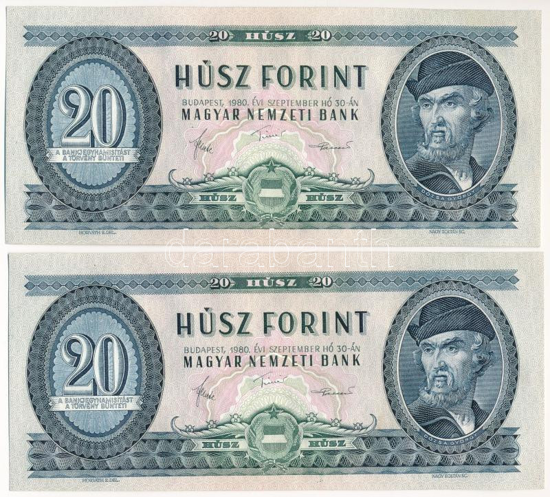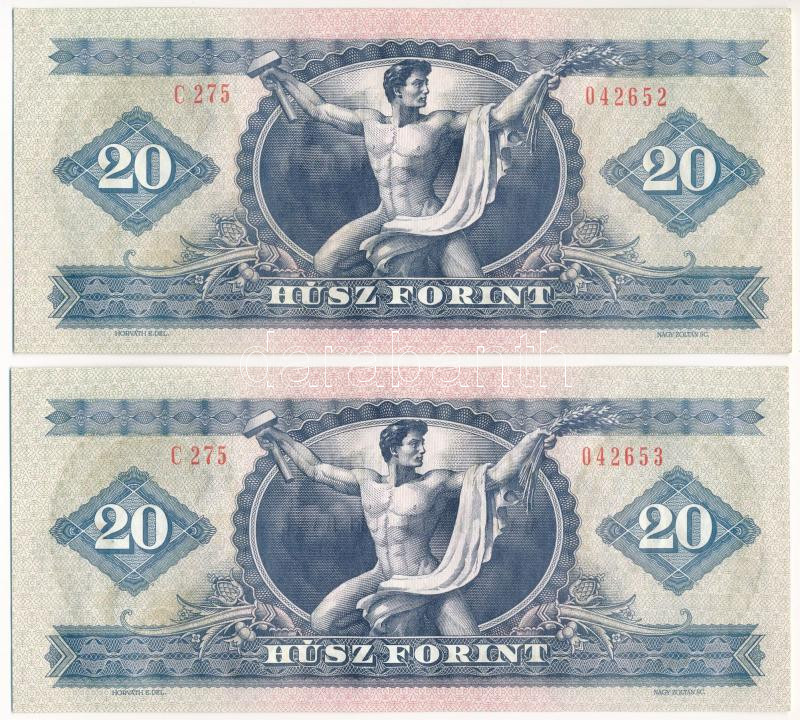 Beschreibung: 1980. 20Ft (2x) sorszámkövetők "C 275 042652 - C 275 042653" T:AU Hungary 1980. 20 Forint (2x) consecutive serials "C 275 042652 - C 275 042653" C:AU Adamo F17