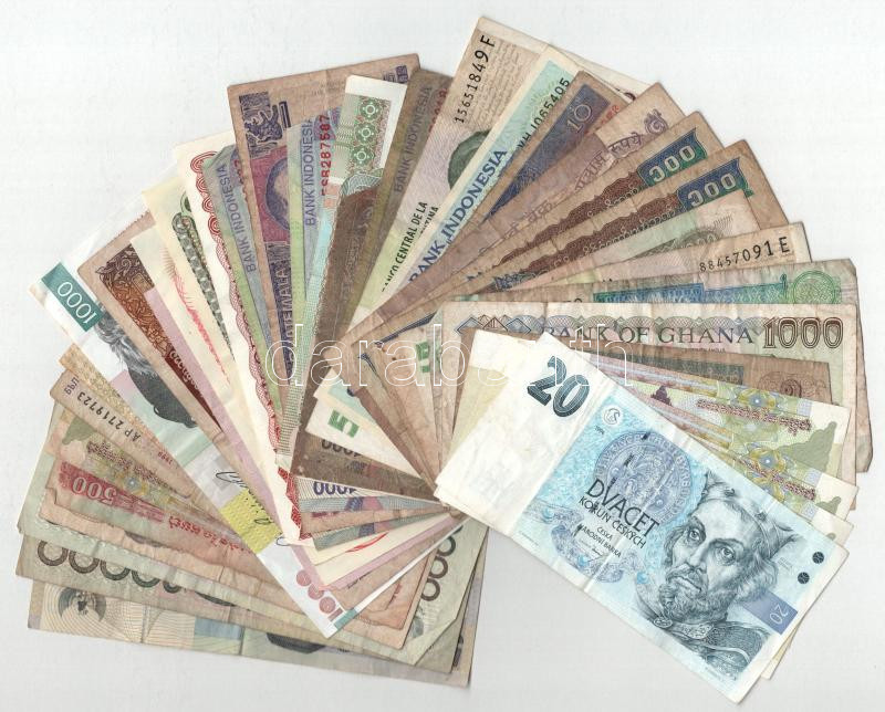 35db vegyes külföldi bankjegy, közte Argentína, Indonézia, Kolumbia, közte Csehország 1994. 20K T:F,VG 35pcs of mixed banknotes from diff countries, with Argentina, Indonesia, Columbia, with Czech Republic 1994. 20 Korun C:F,VG