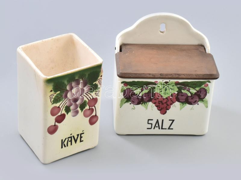 2 darab antik fajansz tárolóedény. Hollóházi Riolit kávétároló, sérülésekkel, fedél nélkül, m: 14,5 cm + Gránit fali sótartó, kis kopással, 15x10x16 cm