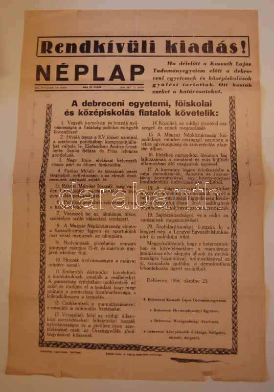1956 október 23. A debreceni Néplap rendkívüli kiadása https://www.darabanth.com/de/46-Fernauktion/46.0/Andere-Sammelgebiete/~175/1956-oktober-23-A-debreceni-Neplap-rendkivuli-kiadasa~II92746