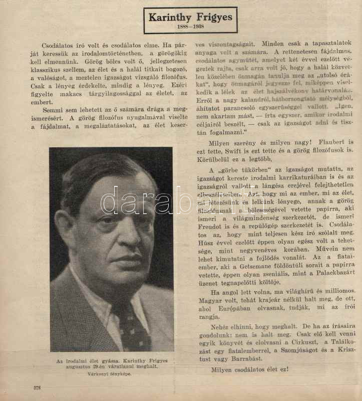 Fényképes nekrológ Karinthy Frigyes elhunyta alkalmából (1938.VIII.29)... https://www.darabanth.com/de/46-Fernauktion/46.0/Andere-Sammelgebiete/~175/Fenykepes-nekrolog-Karinthy-Frigyes-elhunyta-alkalmabol-1938VIII29-Uj-Idok-1938IX11~II92489