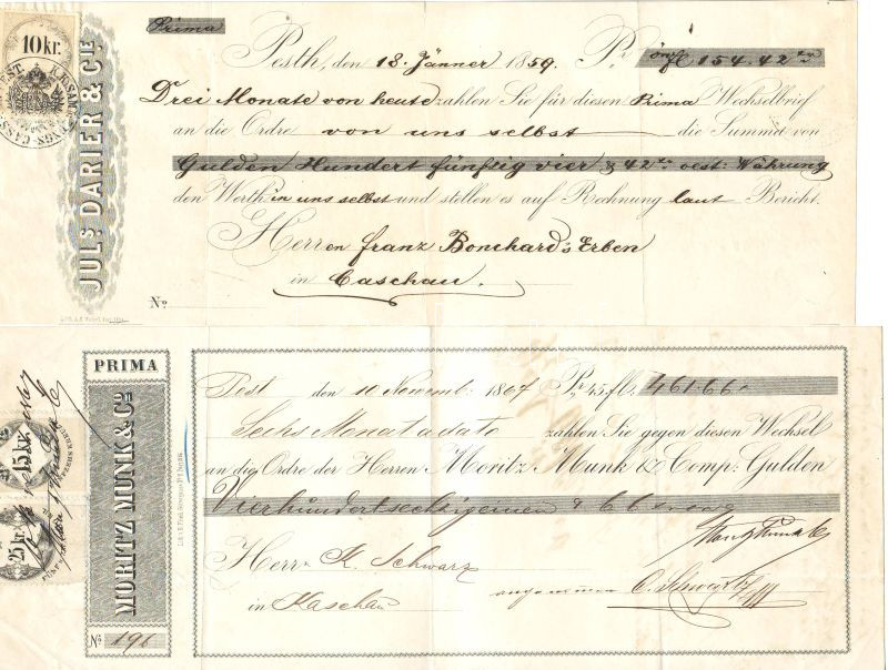 1859+1867. 2 db okmánybélyeges váltó, keltezett:Kassán https://www.darabanth.com/de/46-Fernauktion/46.0/Numismatik/~186/1859plus1867-2-db-okmanybelyeges-valto-keltezettKassan~II93227
