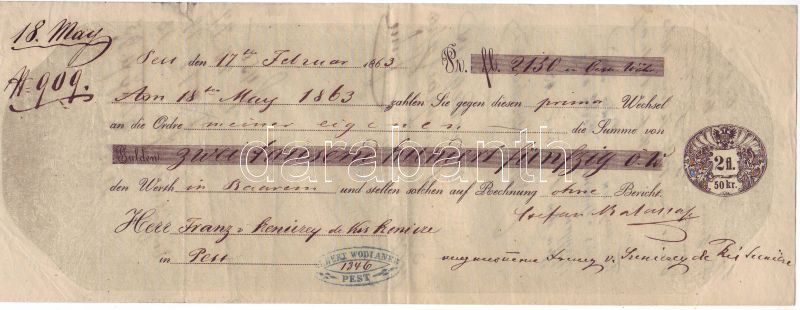 Beschreibung: 1863. Váltó benyomott 2Fl 50kr bélyeggel, keltezett:Pesten