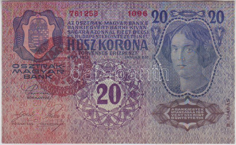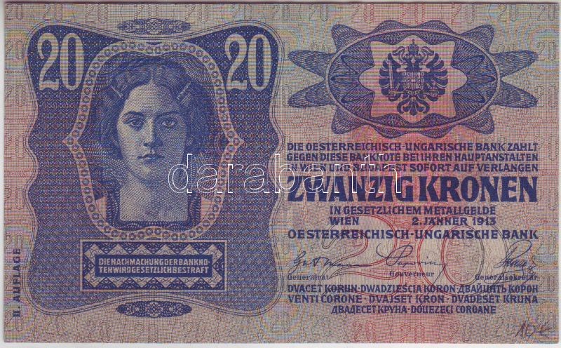 1913. 20K II.kiadás piros magyar körbélyegzővel T:II+ Csak egyszer hat... https://www.darabanth.com/de/46-Fernauktion/46.0/Numismatik/~191/1913-20K-IIkiadas-piros-magyar-korbelyegzovel-TIIplus-Csak-egyszer-hatjva~II92955