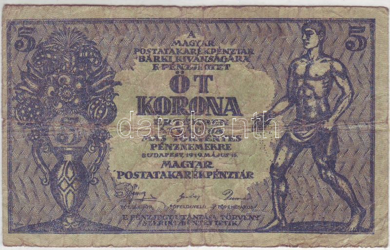 1919. 5K variáns "...más törvényes" T:III https://www.darabanth.com/de/46-Fernauktion/46.0/Numismatik/~191/1919-5K-varians-mas-torvenyes-TIII~II92951
