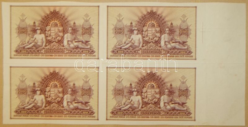 1943. 100P "Szálasi" fázis, csak hátoldali nyomat, előlap csak alapnyomatban, ívszél illesztőkeresztekkel, fekvő 4-es tömbben T:I,II felső pár csak egyszer hajtva!