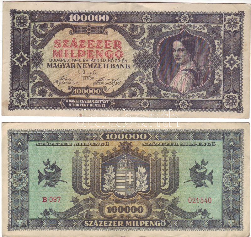 1946. 100.000Milpengő (2x) mindkét példányon "Százezer..." erősen lecs... https://www.darabanth.com/de/46-Fernauktion/46.0/Numismatik/~191/1946-100000Milpengo-2x-mindket-peldanyon-Szazezer-erosen-lecsuszva-plus-egyiken-alapnyo~II93229