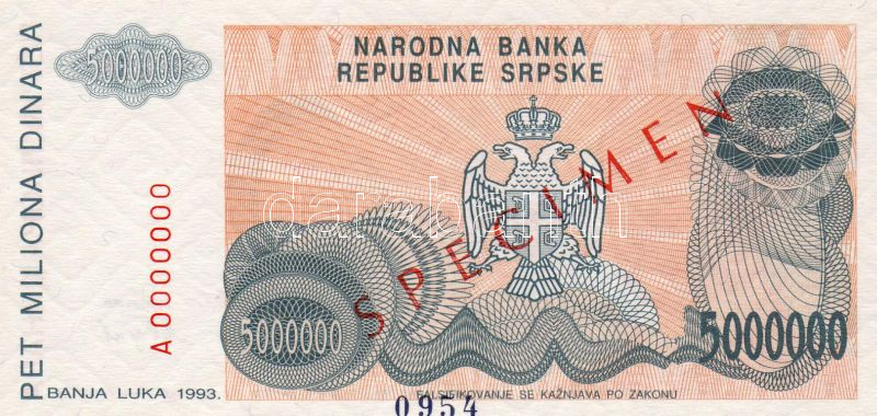 Beschreibung: Bosznia 1993. 5.000.000D Minta "000" sorszámmal T:I